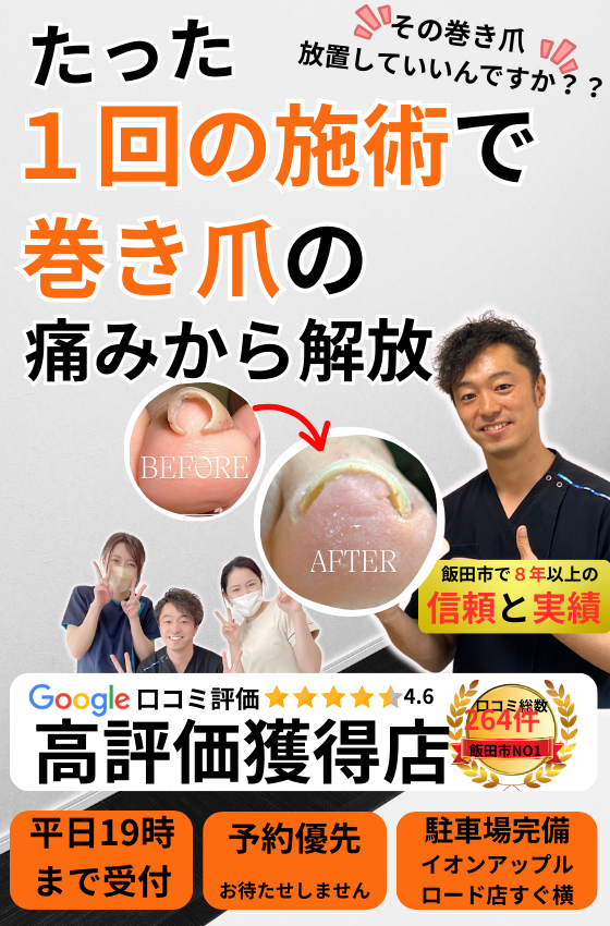そこで飯田市の巻き爪ケア専門サロンアレイズでは無料写真相談を受け付けております。スマホ、携帯電話で自分の爪を撮影していただき、下記LINEまで詳細を添えてご連絡ください♪